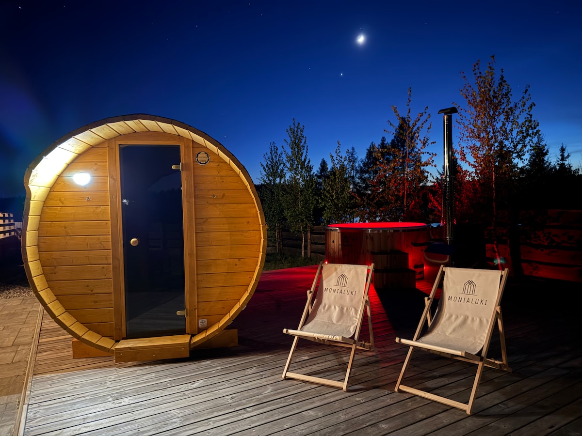 Monialuki to dwa domki letniskowe całoroczne o nowoczesnym designie, komfortowym i przytulnym wnętrzu. Każdy z przestronnym tarasem, w pełni wyposażoną kuchnią, klimatyzacją i kominkiem - dla jeszcze lepszego klimatu. Są położone zaledwie 50 metrów od jeziora, w bliskim towarzystwie lasu, w woj. kuj.- pom. Tutaj natura współgra z luksusem. Tutaj znajdziesz ciszę i ukojenie połączone z aktywnym wypoczynkiem. Tutaj…będziesz chciał zostać, a przynajmniej wracać. W cenie sauna, balia i kajaki!