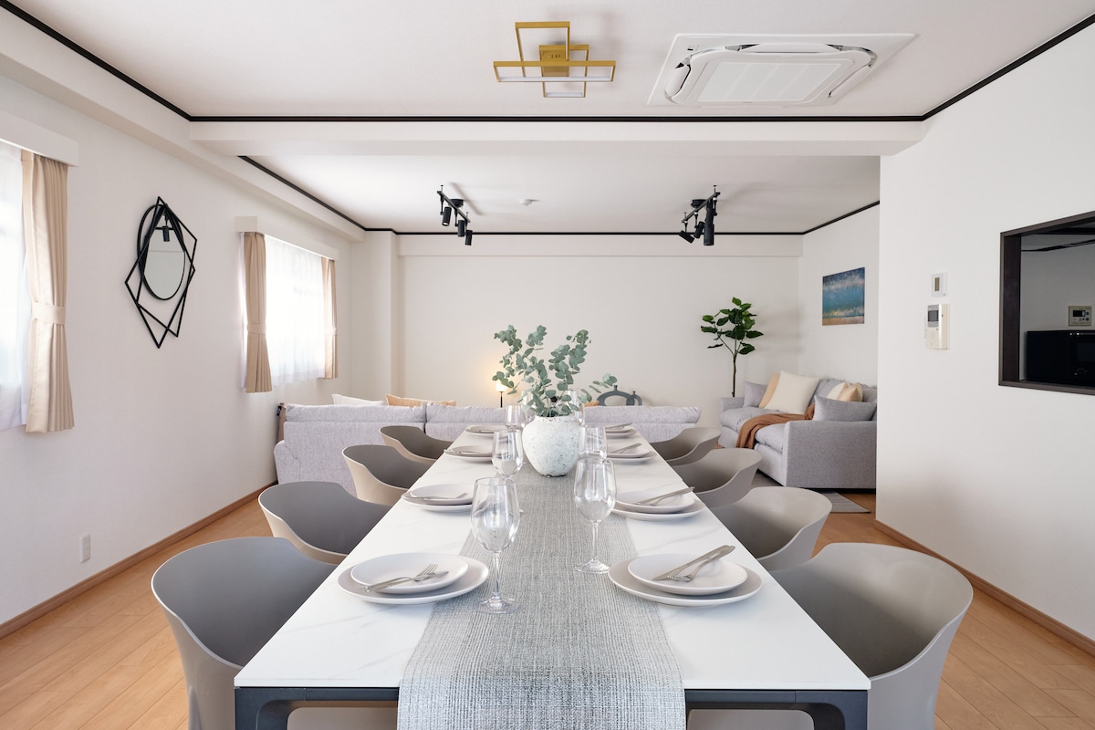 Amplio y luminoso Kyomachiya. El tamaño de la habitación es de unos 99 metros cuadrados y el interior tiene un acabado sencillo para mantener la limpieza. ❖ Cada vez que limpies, primero pásale una toallita desinfectante desechable con alcohol. No solo las manijas e interruptores que tocan las manos, sino también los sofás, las mesas y los pisos se limpian con alcohol cada vez para que estén limpios. Además, dado que todo el edificio está reservado, puedes alojarte con total tranquilidad en cualquier momento sin tener contacto con otros huéspedes.