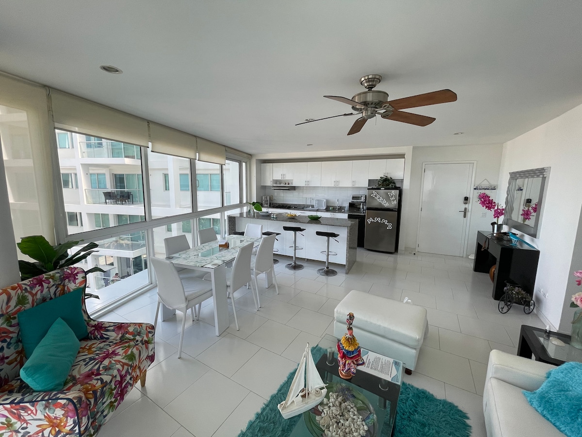 Cartagena Ed Spiaggia. Acogedor, hermoso y amplio apartamento frente a playa, elegantemente amoblado y con comodidades para disfrutar días inolvidables. Salida directa al mar. Espectacular terraza con comedor, asoleadoras, hamaca y hermosa vista. Fácil acceso a 5 min. de aeropuerto y 10 min. del centro histórico. Terrazas con piscinas, jacuzzis, saunas, juegos acuáticos,gimnasio y vista 360°. Restaurantes y supermercados. Empleada disponible adicional.Check in 3 pm,check out 11am sin excepción