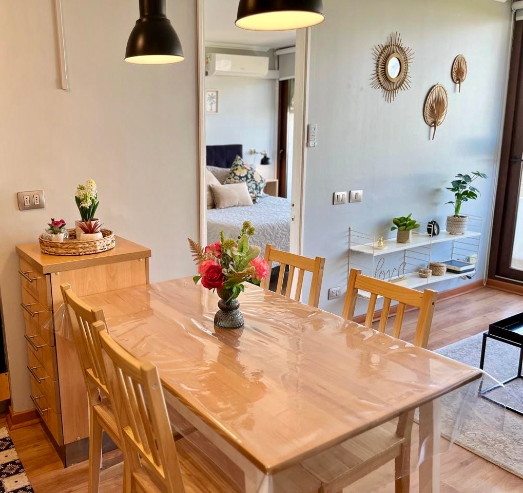 Luminoso departamento, bien equipado con piso flotante en living y dormitorio. El dormitorio tiene cama Box Spring de 2 plazas, impecables sabanas, tiene un Smart Tv led cuenta con Netflix , internet via wifi. La cocina cuenta con refrigerador, horno eléctrico, microondas, tostador, ollas y utensilios de cocina para cocinar. Tiene loza y cuchillería completa. Si esta mas de 6 noches dejo sabanas de recambio. El balcón cuenta con una terraza con mesa y 2 sillas.