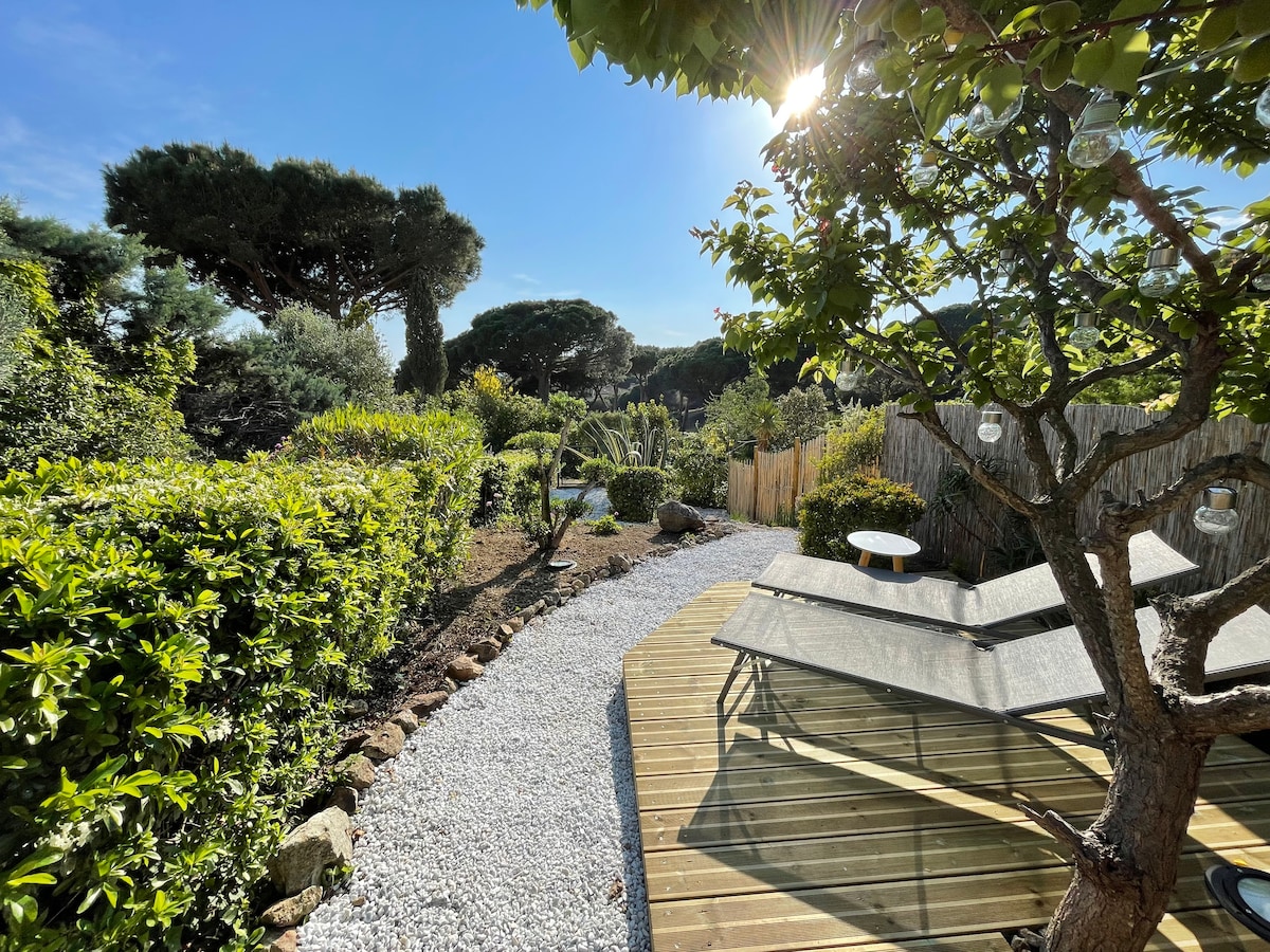 En el dominio de Mas de Gigaro. La playa de Gigaro se encuentra en la parte baja de la residencia. A 50 m por debajo del Club House🛜/piscina comunitaria de pago 10€/semana / 4 pistas de tenis 40€/semana. Terreno de petanca . Pequeña piscina privada /segura /días pares. El auténtico encanto provenzal, elegante y acogedor, acurrucado en su diván para admirar este lugar mágico. El mar con sus vistas a las islas. Un sueño.. A 20 minutos de St Tropez .
