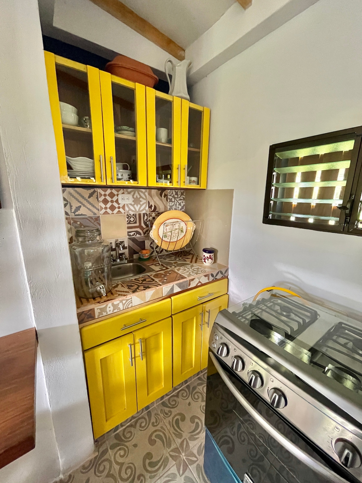 Al ingresar al espacio, una mini sala con un pequeña barra en la esquina forma el espacio perfecto para trabaja o una comida ligera para dos, ya que es un lugar íntimo. El apartamento ofrece un baño completamente equipado para tu comodidad, aunque ten en cuenta que no hay calentador de ducha. La habitación está equipada con un mosquitero, un ventilador para mantenerte fresco y un armario para tu conveniencia, asegurando una estancia cómoda y reparadora.