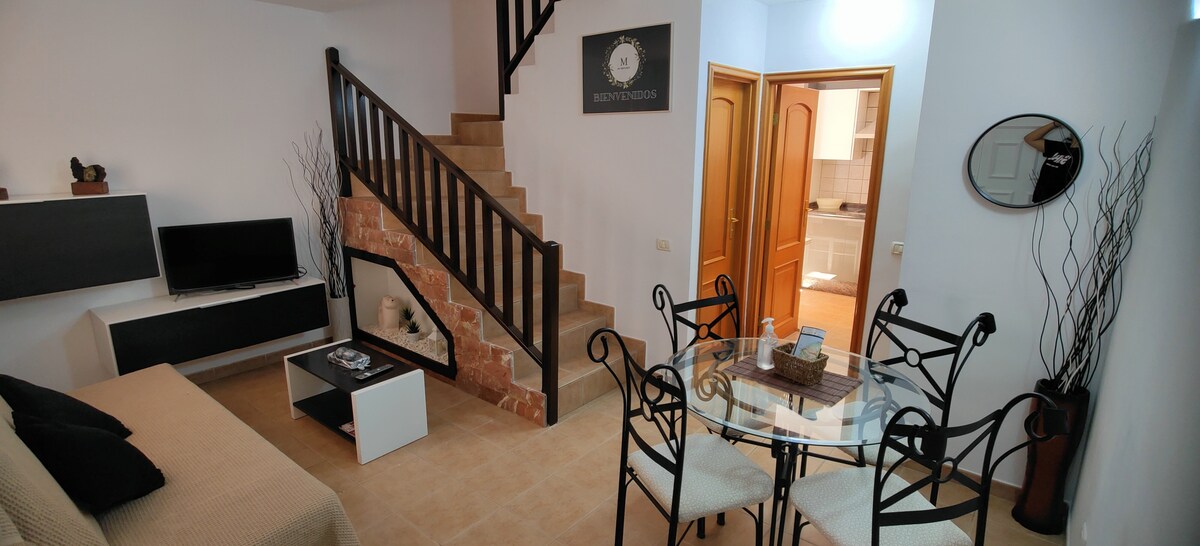 Apartamento de un dormitorio , rodeado de jardín canario con arboles frutales y palmeras, cerca de la piscina y barbacoa. Magníficas vistas de la puesta de sol desde la azotea.