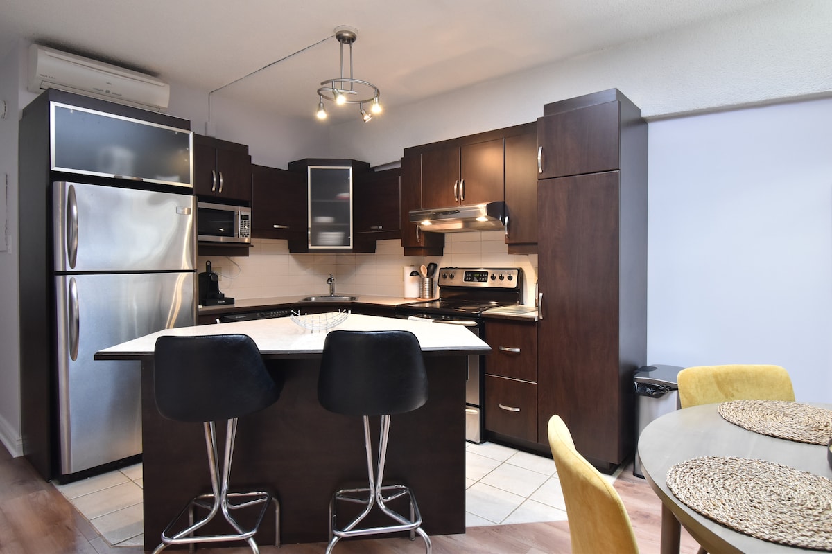 ¡Disfruta de tu estancia en el centro de la ciudad! ¡Nuevo TDC 2 de lujo en el centro con acceso directo al Bell Center! ¡Disfruta de la comodidad de nuestro apartamento de un dormitorio totalmente amueblado y equipado con balcón privado propio! Tu estancia incluye acceso a sauna, piscina, gimnasio, salón panorámico, sala de juegos, salón y terraza con múltiples barbacoas. Aparcamiento subterráneo gratuito, con el metro a pocos minutos. Sin salir, la ciudad es tuya para explorar. Además, relájate con Netflix de cortesía para disfrutar de una estancia perfecta.