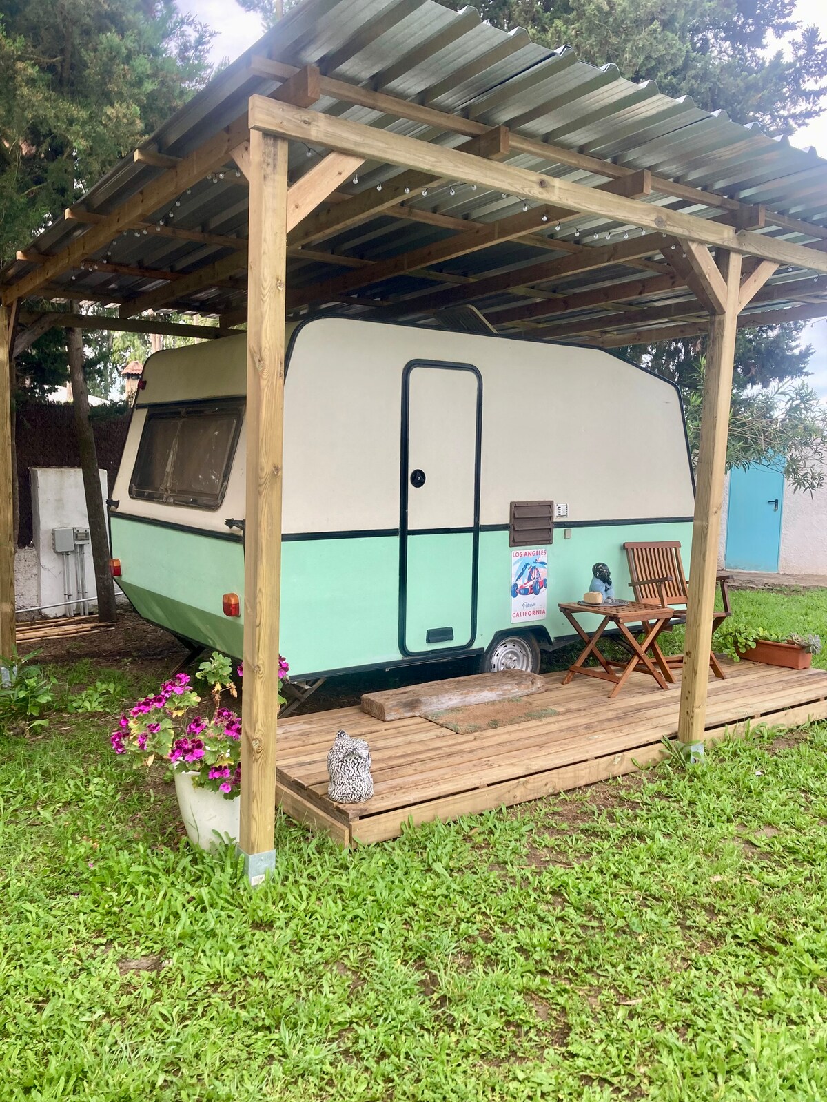 Boho caravan con encanto junto a la piscina.