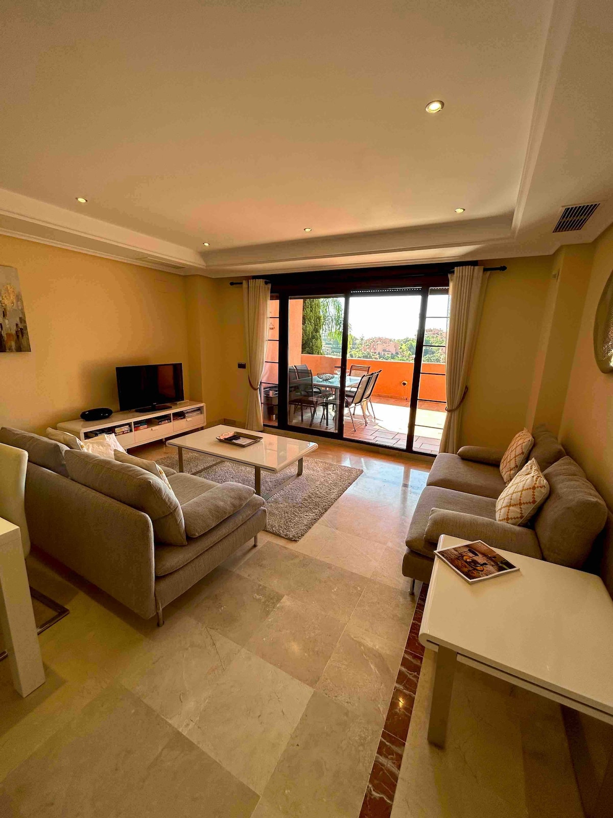 El Apartamento Vista Harmony es la casa de vacaciones de nuestra familia que fue cuidadosamente diseñada para brindar experiencias memorables en la Costa del Sol. Situado en La Cala Golf, este apartamento único cuenta con más de 240 metros cuadrados de espacios interiores y exteriores, incluido un jardín único con vistas a las montañas de Málaga y al mar Mediterráneo. Una amplia sala de estar con cocina abierta y una amplia terraza invitan a pasar veladas memorables.