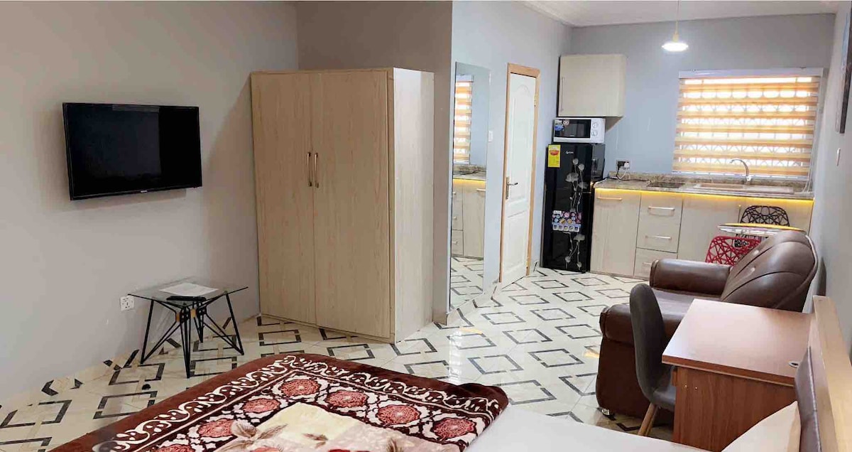 Departamento polivalente de Accra. Estancia de lujo con opciones para optar por los servicios del hotel. Apartamento de 1 o 2 camas con sala de estar, todas las instalaciones incluidas, cocina, baño privado. Ubicado cerca de North Legon. Cerca de los principales centros comerciales y del CBD. A 15 minutos en coche del aeropuerto. Transporte disponible previa solicitud. DSTV listo. A pocos metros a pie de los restaurantes. Desayuno disponible, etc.