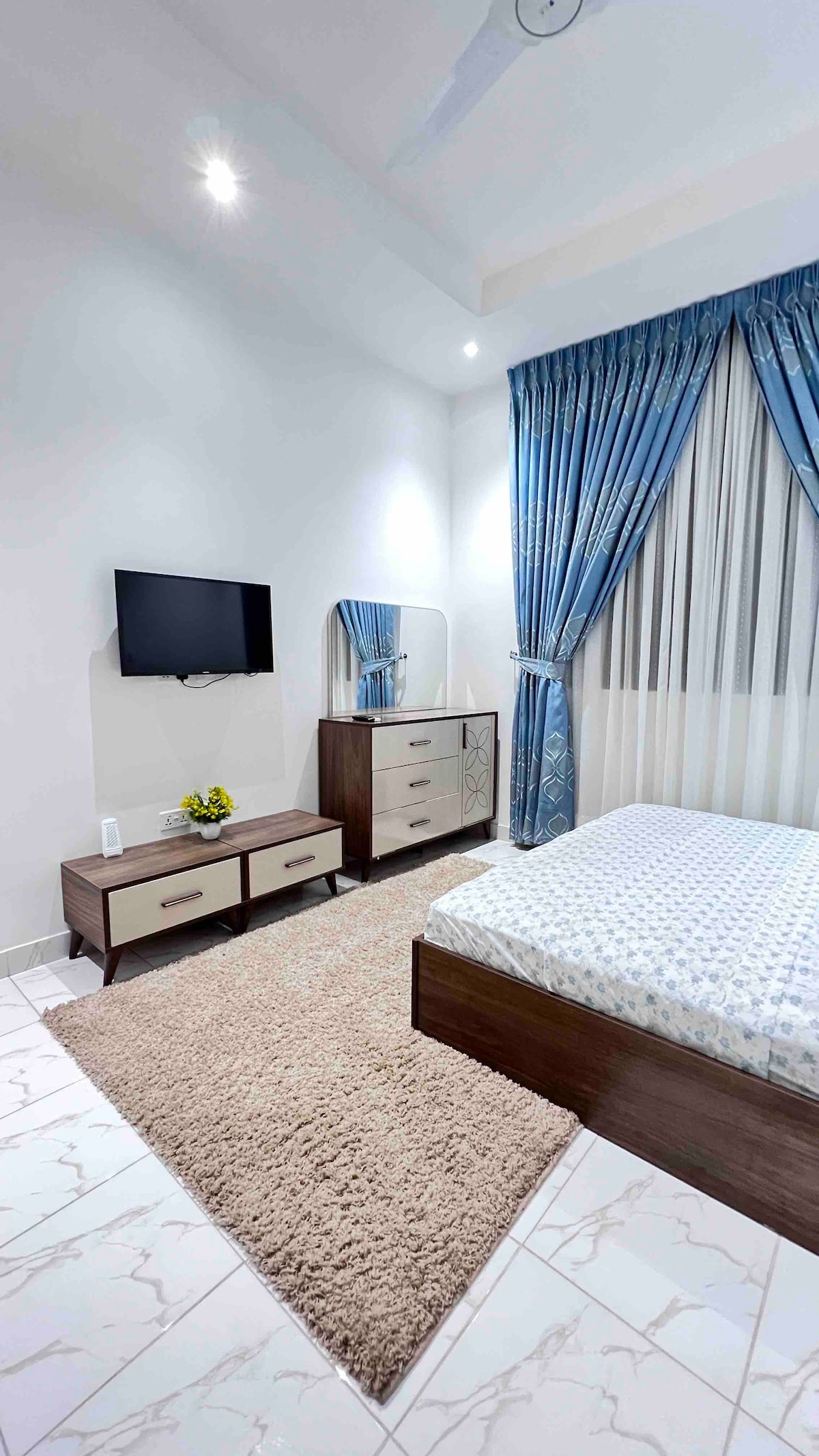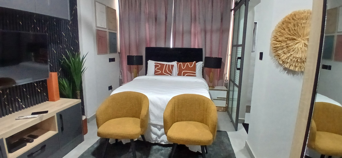 Un apartamento de tres dormitorios con una plaza de estacionamiento, wifi. Hemos proporcionado un DSTV con varios canales para la comodidad de nuestro huésped. También hay un comedor para el huésped. El bedrooma está amueblado con las especificaciones más altas. El pasillo o sala de estar está amueblado para recibir amigos y relaciones con los huéspedes. Las tres habitaciones pueden alojar a tres huéspedes. Tenemos dos baños y dos inodoros para nuestro huésped. Se proporcionan aire acondicionado en todas las habitaciones, incluido el pasillo.