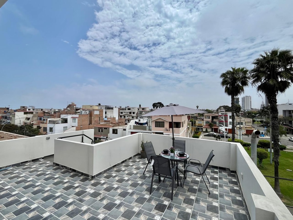 Limpio, moderno y acogedor apartamento de 2 habitaciones, con 2 baños. Apartamento completo muy amplio ubicado en el segundo piso. Ideal para viajeros solos, parejas o familias. A 6 calles está Plaza Vea con cajero automático ATM, a dos calles de la Costanera y a 15 minutos del aeropuerto. Siéntete como en casa teniendo todo lo que necesitas. La avenida Santa Rosa es transitada y segura, estamos a 8 min de Mall Plaza San Miguel y a 20 min de Miraflores