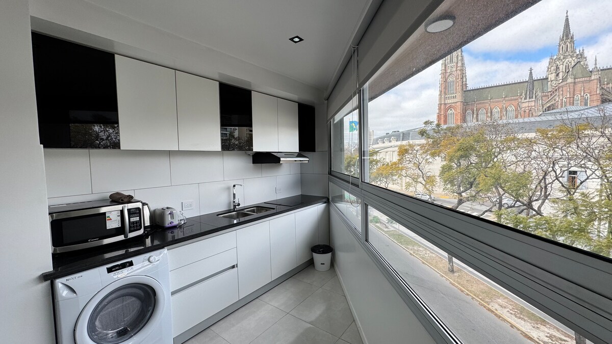 Viví La Plata desde un espacio moderno y acogedor. Este departamento de categoría, ideal para dos personas, combina confort y diseño con una experiencia única: la vista privilegiada a la Catedral, emblema de la ciudad. En la planta baja encontrarás una cafetería de especialidad, perfecta para comenzar la mañana con un buen café o relajarte al final del día sin alejarte de casa. Su ubicación céntrica te acerca lo mejor de la gastronomía, la cultura y la vida platense.