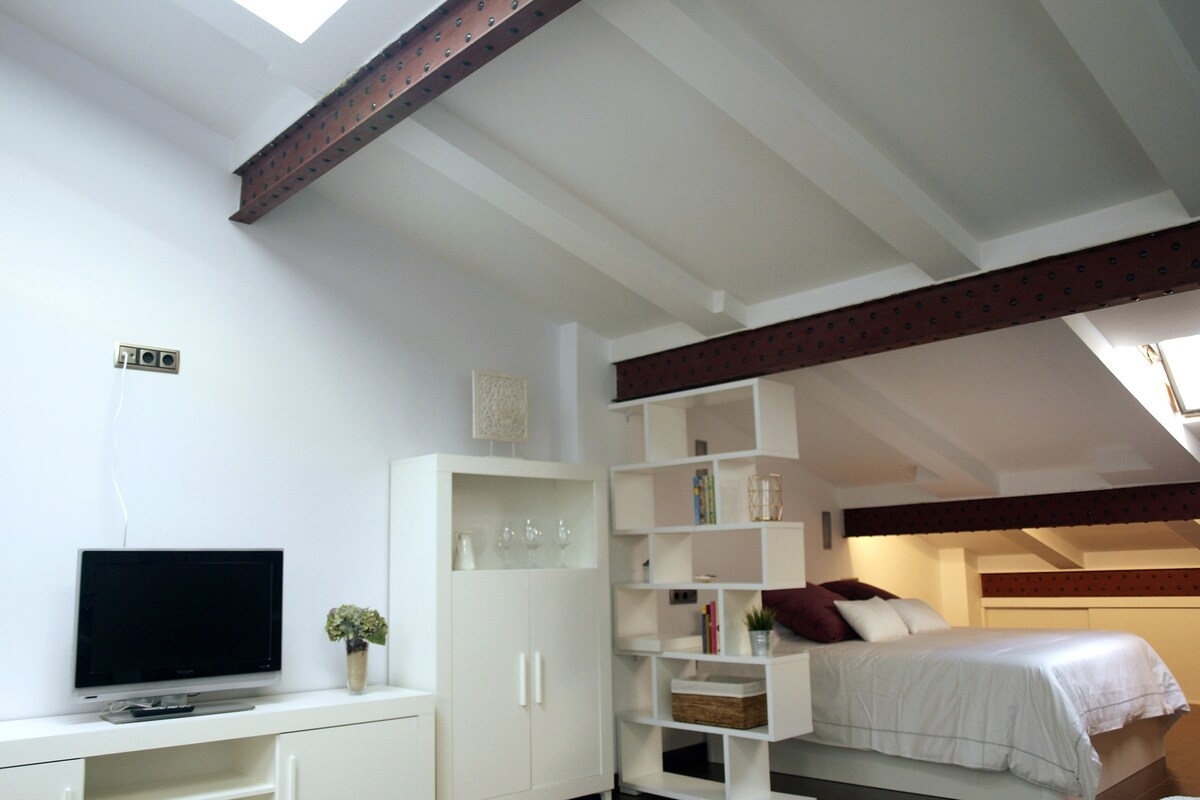 Luminoso y acogedor estudio tipo loft recientemente reformado en el centro de la ciudad, en la Laurel, zona de pinchos. Dispone de todas las comodidades para disfrutar de la estancia: cocina completa, lavadora, baño con ducha, aire acondicionado y calefacción, televisión, WiFi... además de sábanas, toallas y elementos básicos para la estancia (gel, champú, café, aceite...).