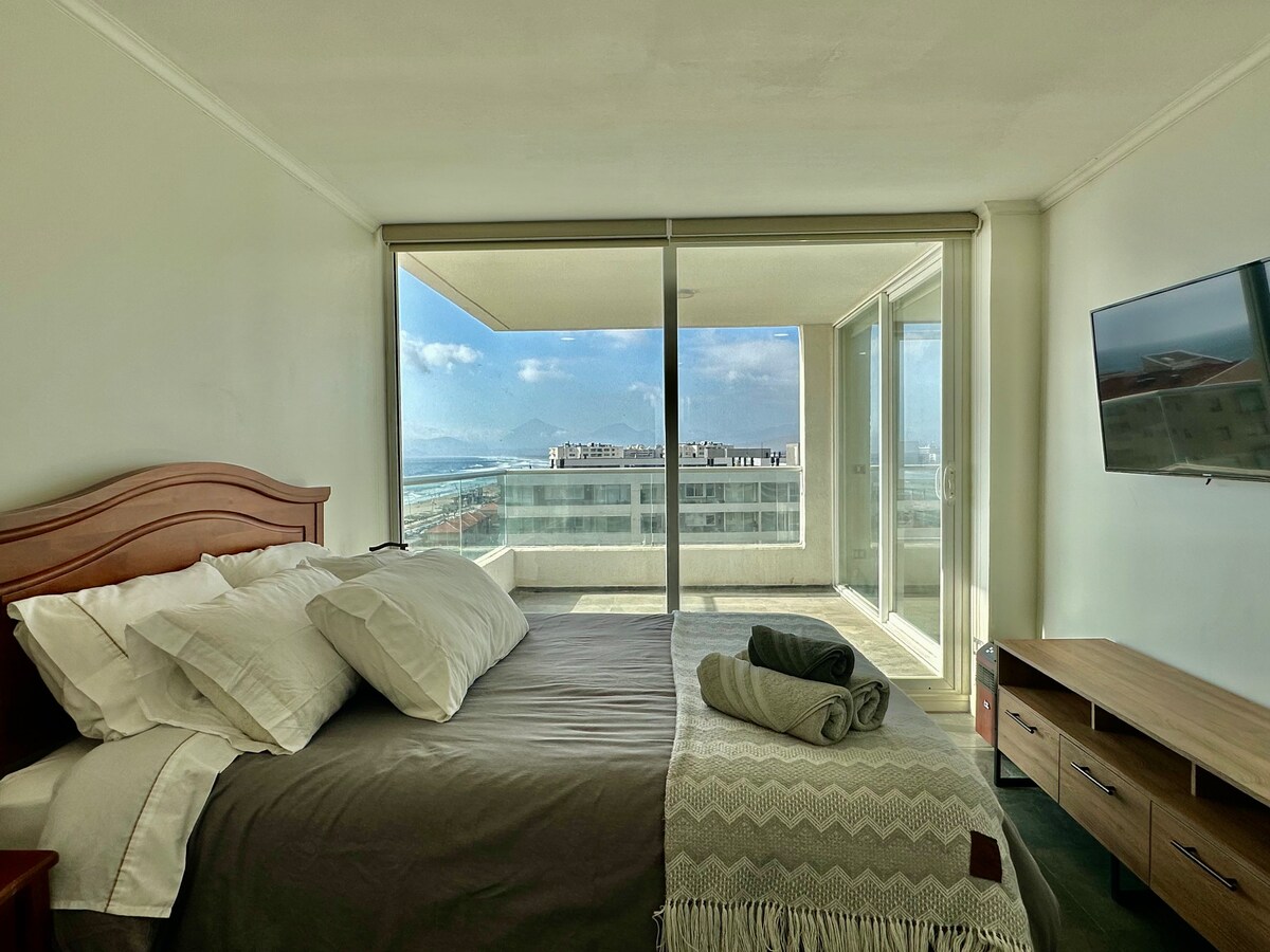 Escapate frente al mar con tu familia. En cualquier época del año, sientete como si estuvieras en tu hogar. Atardeceres desde la terraza, donde se ve toda la bahía de coquimbo y la serena. En las noches cielos despejados y estrellados, respirando el aire marino. Todo esto frente del mar, piso 19, para 5 personas. A un costado del casino Enjoy. piscina al aire libre y vista al infinito. Kinchos Con vista panoramica. Estacionamiento gratis. Saliendo del condominio avenida costanera