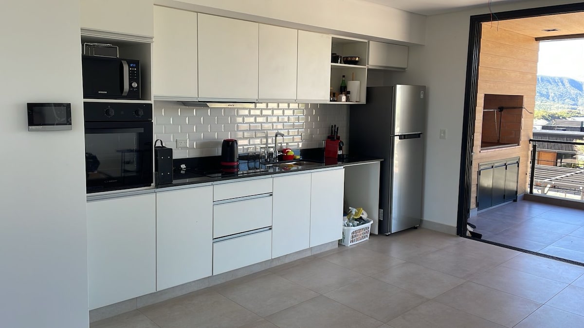 Relajate en este alojamiento único y tranquilo. Hermoso alojamiento con balcón y parrilla con vista al dique cabra corral