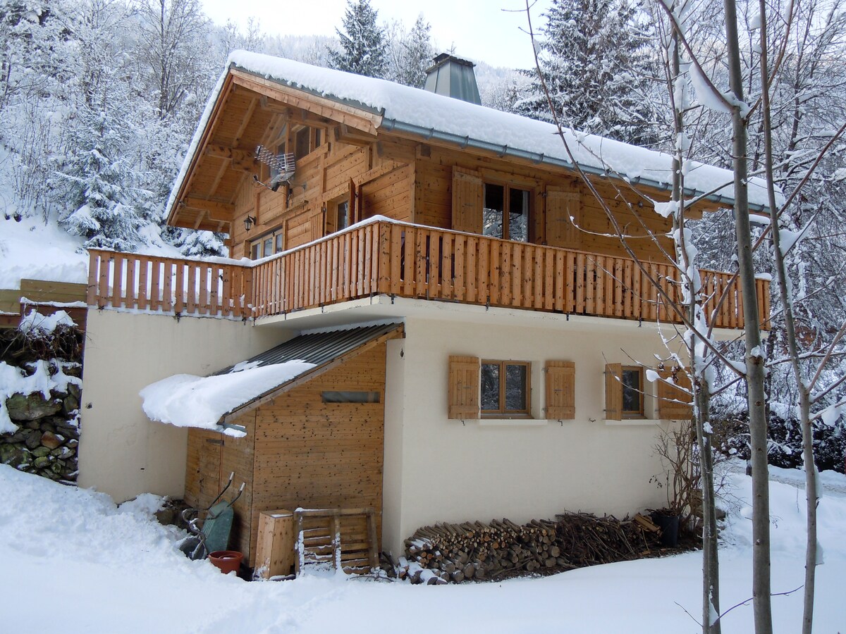 En un tranquilo y encantador pueblo del valle de Chamonix, nuestro chalet está orientado al sur con vistas al Mont Blanc. Todas las actividades de la montaña son accesibles tanto en invierno como en verano a menos de 15 minutos. La casa de madera de laricio cuenta con todas las comodidades modernas con su estufa y la suave calidez de la calefacción por suelo radiante. La cocina moderna está abierta a la cálida y soleada sala de estar. 4 dormitorios, incluyendo 2 principales con baño, 1 dormitorio para 1 pareja y 1 dormitorio para 3 personas.
