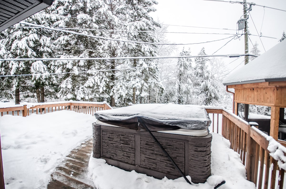 Escápate al lujo en nuestra casa de campo en la cima de la montaña, con un diseño de concepto abierto y una vista exterior de 180 grados del monte Tremblant. Ubicado cerca de las principales características turísticas, como el esquí, el surf de remo, el casino Mt-Tremblant, los campos de golf y los senderos de skidoo, nuestro refugio es perfecto para alojar a 2 familias que buscan una escapada inolvidable. Disfruta de la serenidad del impresionante entorno mientras disfrutas de un sinfín de aventuras al aire libre y relájate en la comodidad de nuestro espacioso alojamiento.