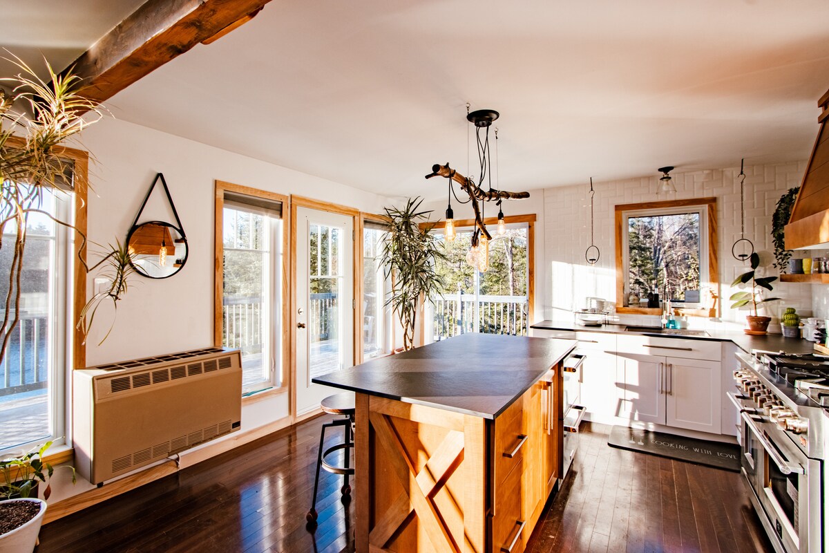 Nestled in nature, this off-grid chalet offers everything you need to relax and reconnect. Equipped with an outdoor kitchen area with a wood fired pizza oven and a round cedar spa (available from May to Sept), 2 paddleboards, 2 kayaks, big inflatable duck, tubing & snow shoes, and a chef’s dream 48-inch range with double ovens. Including reliable high-speed internet, a 55-inch led tv w/ chromecast, under-counter fridges and freezer, a BBQ, and a wood-burning fireplace for cozy evenings indoors.