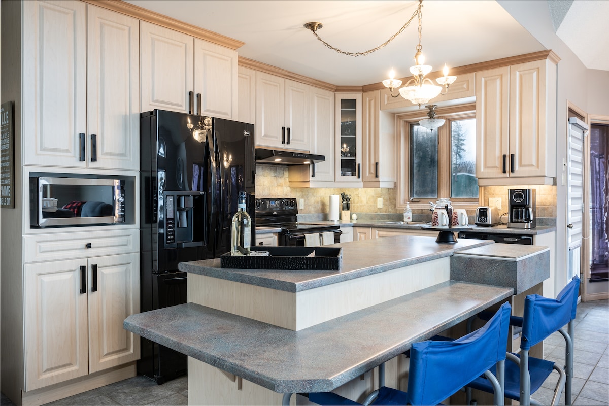 Una suite de lujo única, ropa de cama 100 % algodón, colchón Tempur Pedic, películas con sonido envolvente con iluminación regulable, nevera para vinos, mesa de billar, chimenea, impresionante baño con ducha de vapor, espejo antivaho, toallero con calefacción y asiento de inodoro con bidé. Este encantador refugio para amantes de los libros se encuentra en el centro de New Liskeard, cerca de todo y, sin embargo, completamente privado. Disfruta de tu propia zona de comedor al aire libre con barbacoa, da un paseo por el paseo marítimo o simplemente pon los pies en alto y relájate.