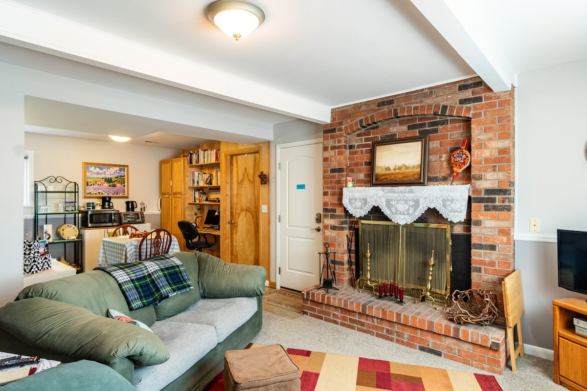 The Bird House is a completely private studio with everything you need! No shared entrance, space or walls and a large private deck with beautiful scenery. This is the perfect place to unwind after a day of exploring! Or cuddle up with the elegant electric fireplace, and login to your favorite streaming services on the TV and relax. The modern kitchen makes cooking simple & convenient and the stunning bathroom with two shower heads will leave you refreshed and never wanting to leave!