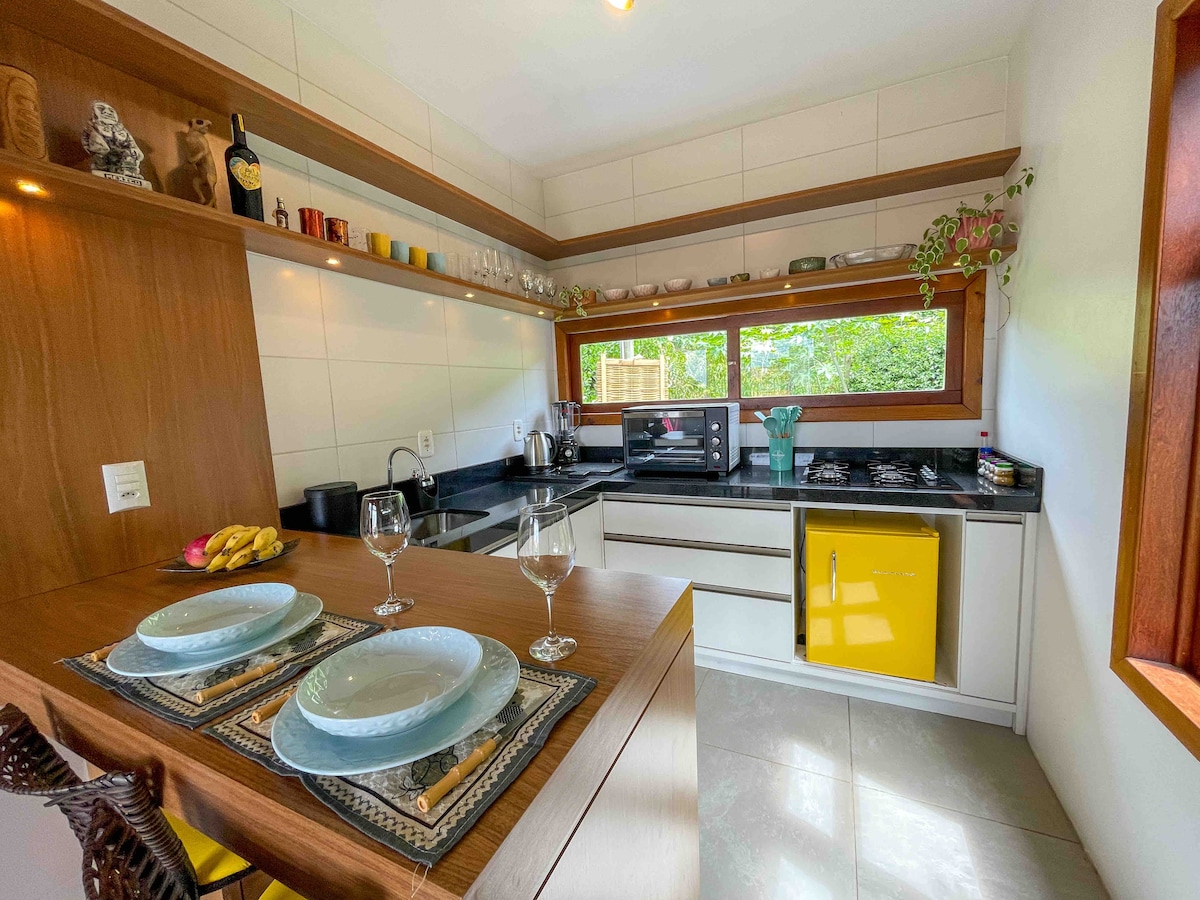 Un pequeño refugio en la barra de Ibiraquera, estudio ubicado en la parte trasera de una casa, con pasillo de entrada privado y zona privada totalmente vallada. Situado junto al mar, es una gran opción para las parejas que quieren tomarse unos días para descansar. El estudio tiene todo lo que una pareja necesita para estar bien acomodada, cocina equipada, aire acondicionado, cama queen size, bañera. La decoración está inspirada en la encantadora Tailandia.