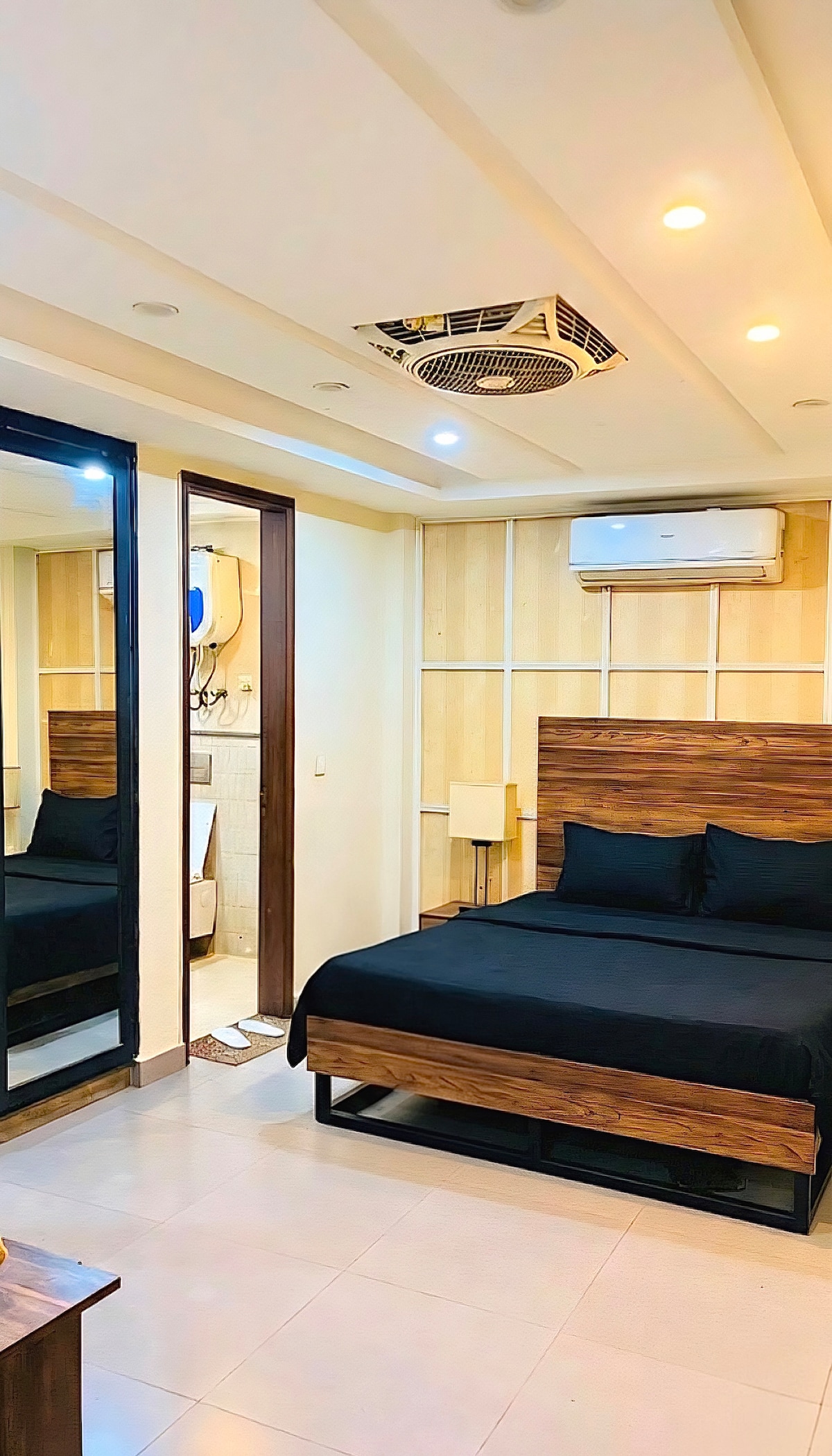 Our 1 BHK Orbit Penthouse in DHA Phase 5 is where urban chic meets celestial cool. Think: a glowing moon wall for those late-night selfies and a bold dollar-stacked art piece that screams "main character energy" Wake up to park views from your private balcony swing, binge your faves on the 50" 4K Smart TV, or cook up something aesthetic in the fully loaded designer kitchen. The interiors? Abstract, stylish, and made for the feed. Plus, you're right next to Lahore's hottest dining spots.