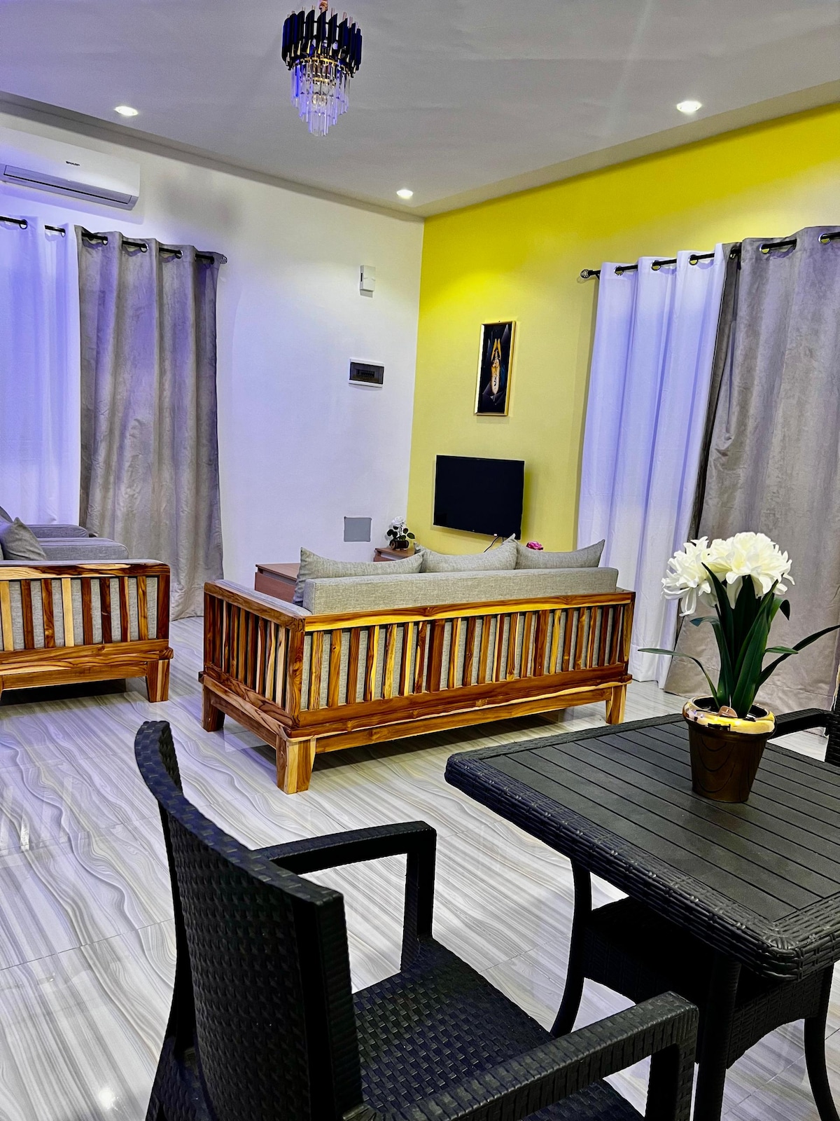 Découvrez ce superbe appartement deux pièces, parfait pour un séjour agréable et reposant. Entièrement rénové avec une décoration moderne et soignée, il offre tout le confort nécessaire, à 30-45min de trajet de l’aéroport et de la plage selon la circulation et se situe à Maria-gleta dans l’arrondissement de Godomey . La salle de bain raffinée est équipée d’une cabine de douche et d’une vasque à l’italienne , de l’eau chaude , lave-linge, du désinfectant et d’un bidet pour un confort optimal