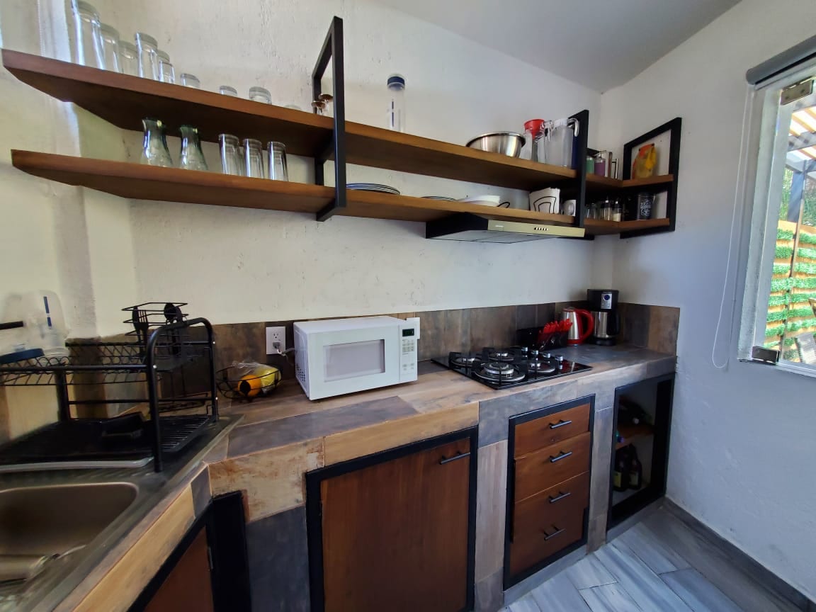 Es una increíble casa de campo en una huerta de aguacates. Ubicada en San Juan Atezcapan a corta distancia de Valle de Bravo. Es ideal para retiros y escapadas de la ciudad, para días de descanso y desconecte. Está configurada en dos bloques. En una parte están los espacios públicos, una sala o estancia, comedor, cocina con un baño y un desayunador al exterior. Inmediatamente a un lado están los espacios de descanso. Una habitación principal con cama king, armario, terraza y su propio baño.
