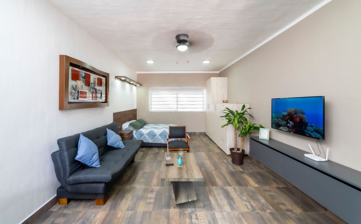 Internet de alta velocidad ademas desde este confortable Loft podrás tener una locación increíble, sin necesidad de un auto llega en minutos a plazas, restaurantes, cines, malecón etc, el agua potable no esta incluida, va por cuenta de los huéspedes. El baño es pequeño, podría ser incomoda para personas de talla grande. La cama es tamaño Queen zise colchón suave, Al estar en un area centrica concidera que hay sonidos de la vida diaria a los alrededores.