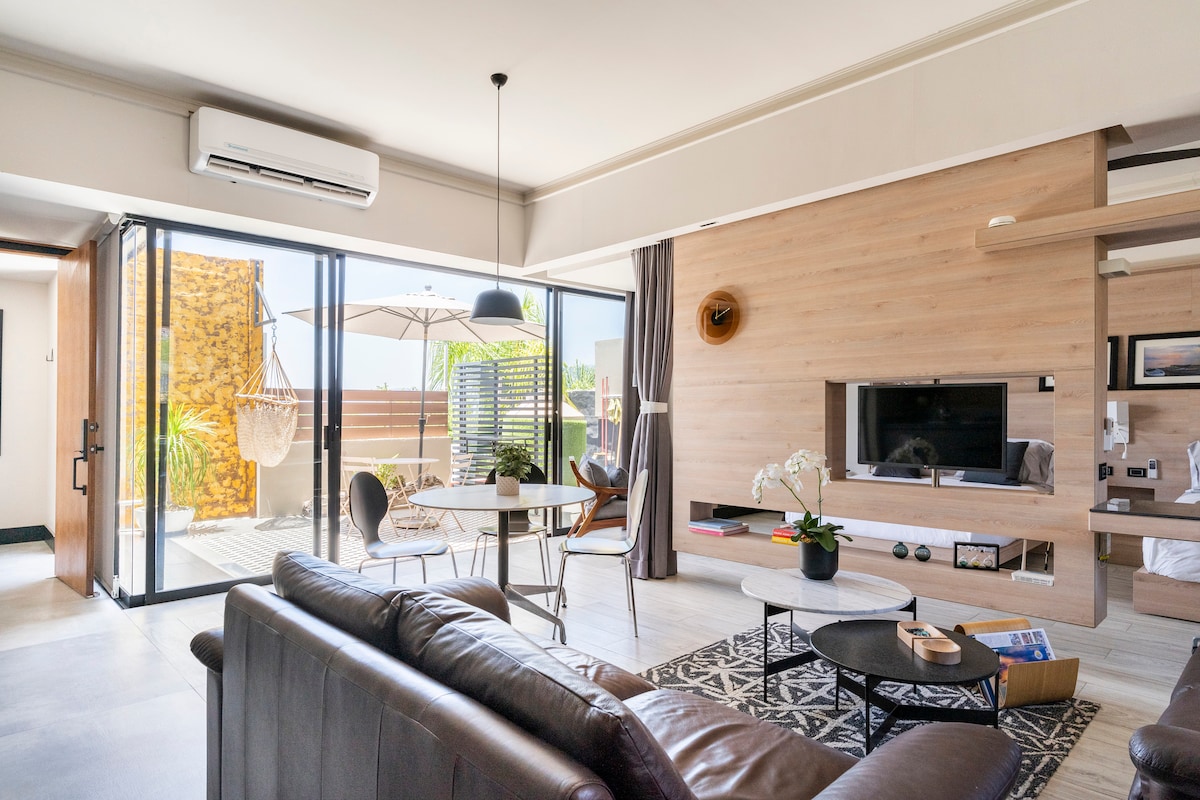 Alojamiento exclusivo para adultos. Riberas Suites es un conjunto de cuatro suites independientes que comparten un jardín central con alberca y terraza. Suite F está ubicada en planta baja, king size bed, cocineta, dos baños completos, sofá cama, área de trabajo, dos terrazas. No se permite fumar, ni fiestas, ni mascotas. La Alberca y el jardín es compartido con las otras habitaciones de la misma propiedad. La propiedad NO cuenta con estacionamiento.