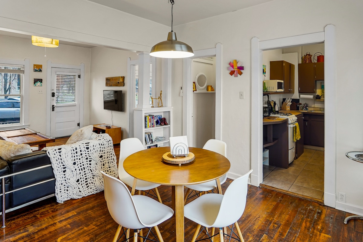 Pintoresco apartamento vintage en «Midtown Durango» idealmente ubicado a 5 manzanas de restaurantes y tiendas del centro de la ciudad y a 2 manzanas del sendero del río Animas. Apartamento de 1 dormitorio y 1 baño apto para perros/niños. El dormitorio tiene una nueva cama tamaño queen de espuma viscoelástica, junto con un sofá cama tamaño queen en la sala de estar, TV inteligente, internet de alta velocidad, cocina con estufa/horno de gas, baño con bañera clásica profunda con patas. El porche cerrado de la cocina conduce a un patio con césped. Nuevo aire acondicionado/calefacción Carrier mini split.