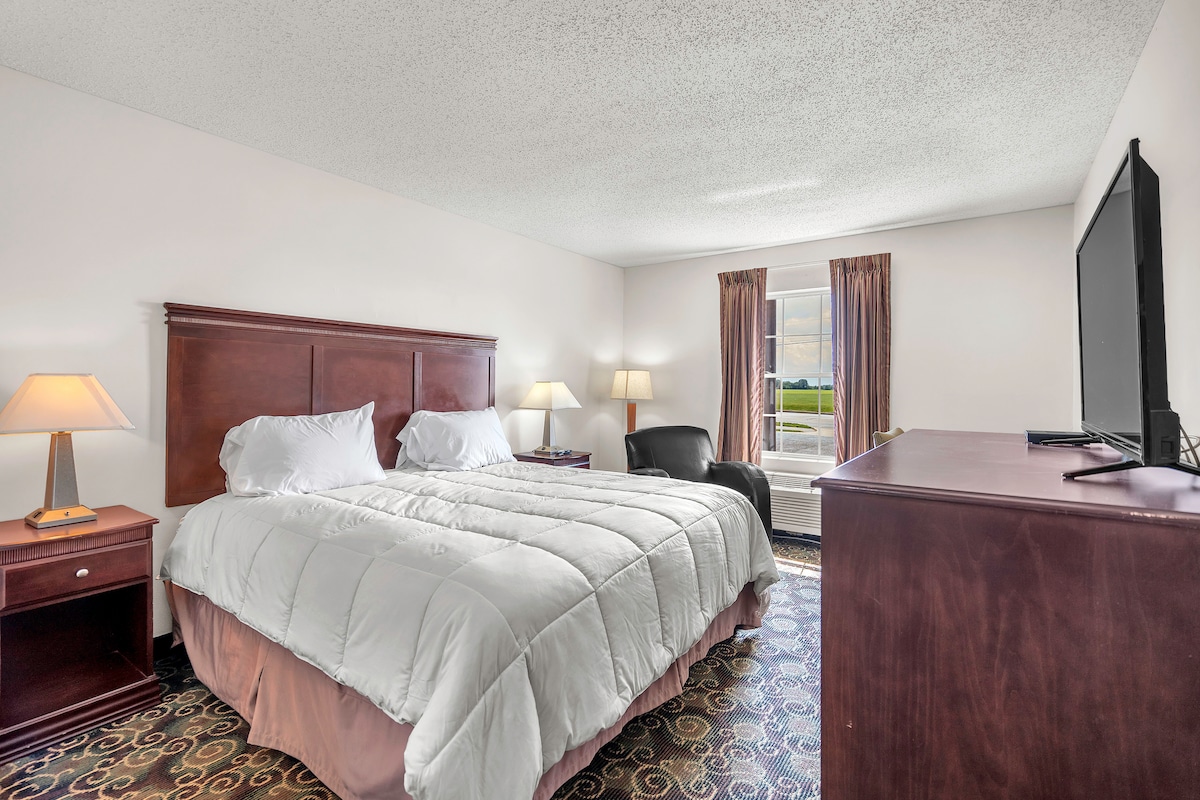 King Room – Spacious, Comfortable & Convenient Unwind in this inviting King Room featuring a plush king-size bed with all the essentials for a relaxing stay. The room offers ample natural light, classic wood furnishings, and a comfortable seating area perfect for lounging or reading. Amenities include air conditioning, free Wi-Fi, AM/FM radio, cable TV, mini fridge, microwave, hairdryer, and ironing board. Ideal for solo travelers or couples looking for comfort and convenience.