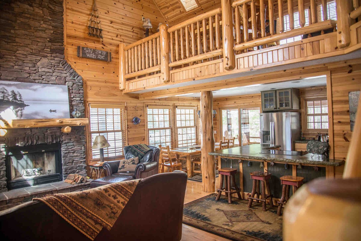 Nuestra acogedora cabaña rústica de lujo de 3 dormitorios y 2,5 baños cuenta con todas las comodidades de un hogar y mucho más. Totalmente amueblada para tu comodidad con toallas, ropa de cama y otras necesidades. Esta cabaña tiene capacidad para alojar cómodamente a 8 personas. Una piscina climatizada y acceso al lago están disponibles desde el Día de los Caídos hasta mediados de septiembre. Lavadora y secadora de tamaño completo en la cabaña para tu comodidad. Para grupos más grandes, pregunta sobre la disponibilidad para alquilar también una de nuestras cabañas afiliadas cercanas.