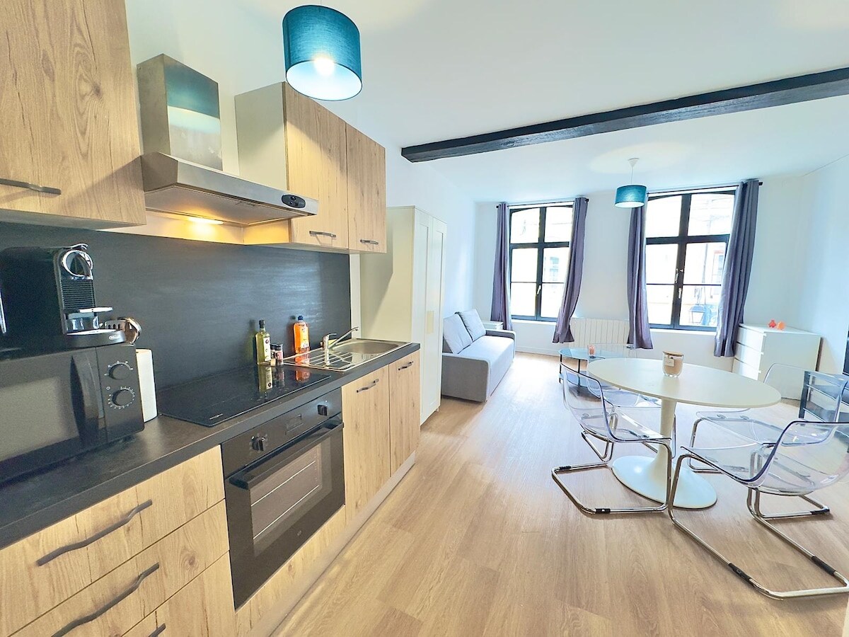 Duplex lumineux de 50m2 avec escalier au 1er dans immeuble sécurisé, au coeur de la ville, idéalement situé entre le beffroi et le palais de justice, avec une grande chambre en mezzanine pour passer un agréable séjour seul ou à deux dans la cité des géants. Parfait aussi pour passer les concours qui ont lieu à Gayant-expo.