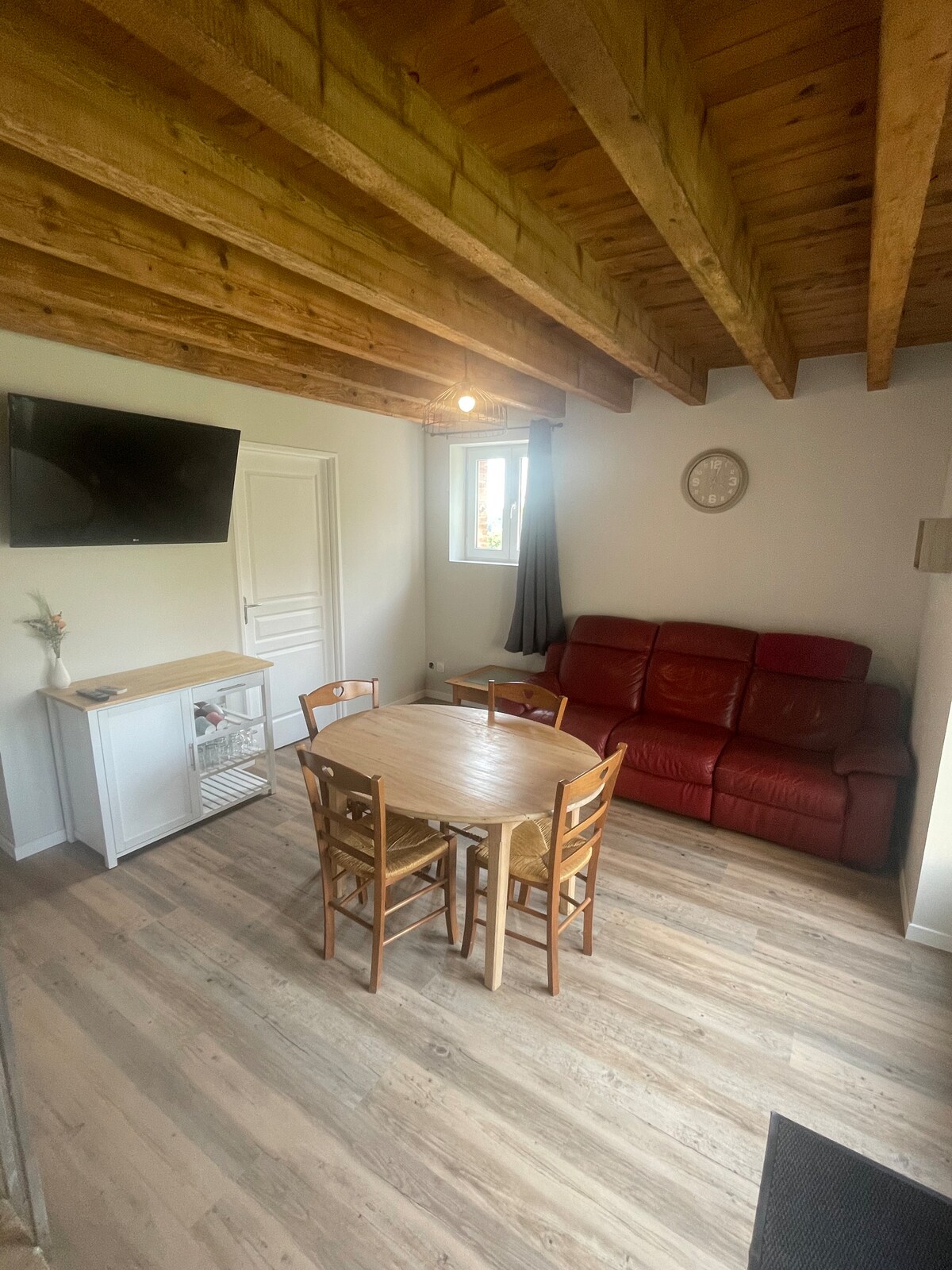 Pequeña casa de 27 m2, situada en medio de los árboles en un entorno tranquilo. Para acceder a ella, deberá caminar por un camino durante 200 metros cuesta arriba. La casa consta de una sala de estar con sofá cama, una zona de cocina, un dormitorio y un baño con inodoro seco. Desayuno no incluido, pero ofrecemos comidas caseras. La potencia máxima es de 800W: compruebe sus dispositivos antes de venir. Nos comunicamos exclusivamente a través de mensajería/correo electrónico, el teléfono no capta aquí.
