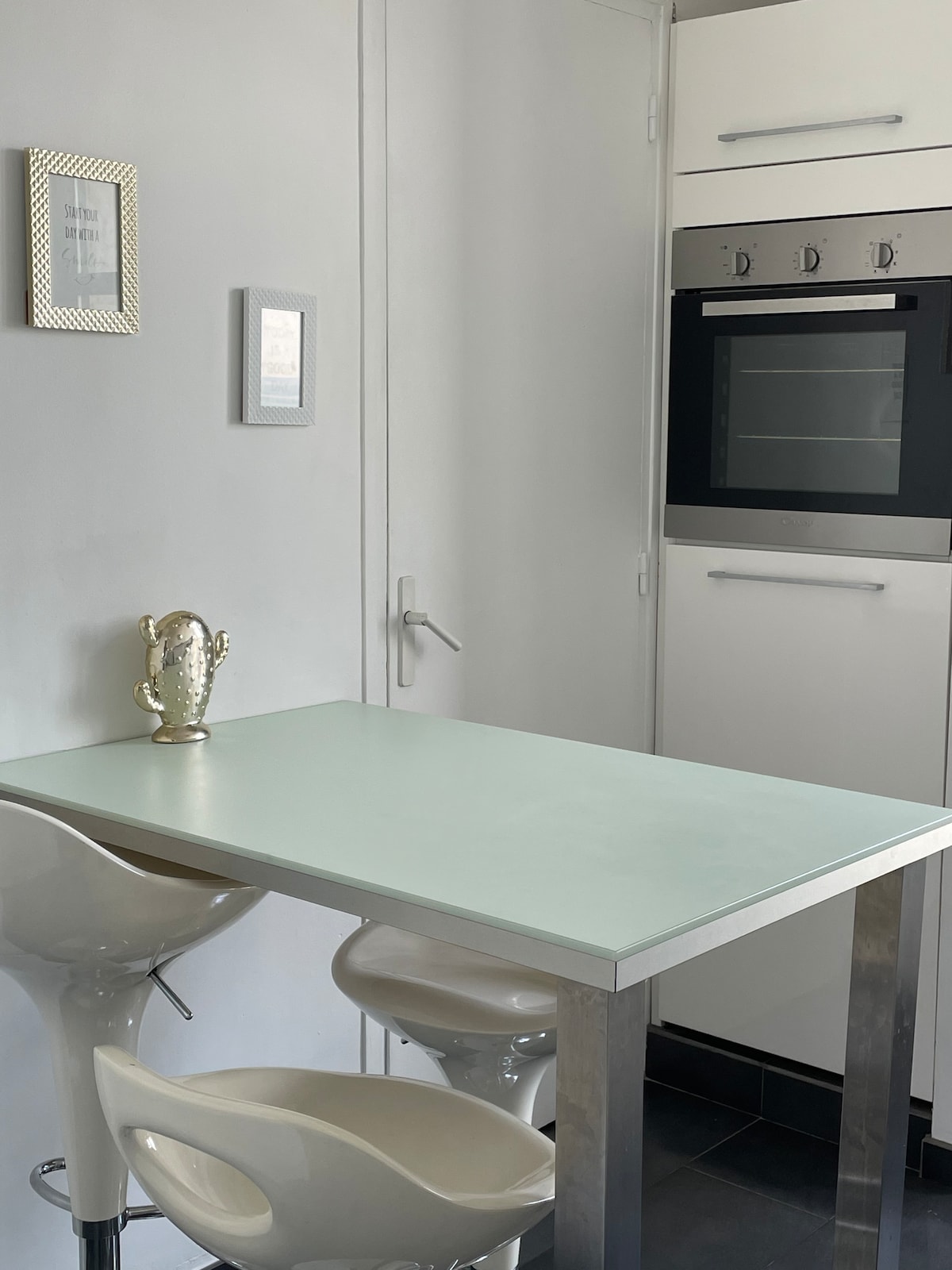 Estudio de 13 m2 totalmente equipado y completamente independiente en la terraza de la residencia privada que incluye: una cocina equipada con zona de comedor (placa de inducción, nevera/congelador, hervidor de agua, cafetera con cápsulas, microondas y utensilios de cocina), una cama individual, una ducha, un inodoro, un lavabo, una televisión y wifi de buena velocidad gracias a un adaptador. El estudio tiene calefacción, sábanas y toallas incluidas. Aparcamiento gratuito en la calle tranquila e iluminada.