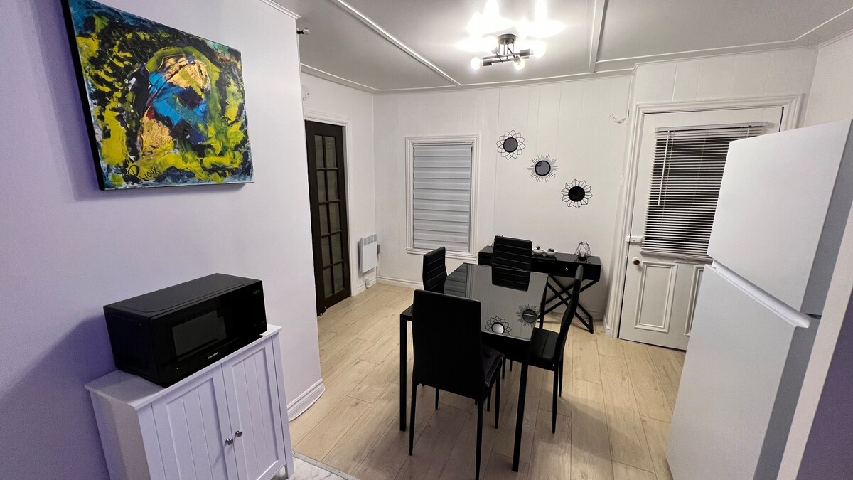 Relájese en este alojamiento tranquilo y elegante situado en un sótano con acceso privado. El apartamento está cerca del aeropuerto y de los grandes almacenes de Quebec. También tiene acceso a todos los festivales gracias al transporte público situado a la vuelta de la esquina. Se han puesto varias atenciones para ofrecerle una experiencia más agradable. Espacio de trabajo bien equipado + Conexión a Internet de alta velocidad (1 Gb/s) = El mejor lugar para teletrabajar :) ¡Diviértase!