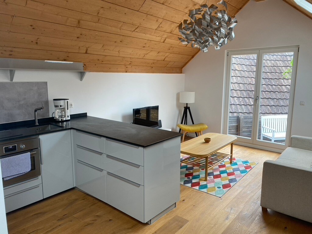 45qm Appartement für 2 Personen mit Duschbad/WC incl.Küche, Spülmaschine, 2 Platten-Induktionsherd, Kühlschrank und Bar mit Sitzplatz. Küche ist ausgestattet zum Essen und Kochen - Besteck, Gläser, Teller, Töpfe etc.. Begehbarer Kleiderschrank vorhanden. Gemütlicher Balkon mit Sitzplatz. Bitte berücksichtigen Sie, dass diese Unterkunft ein großes Doppelbett unter dem Dach hat, mit einer Stehhöhe von 160cm und über eine Holzstiege zu erreichen ist.