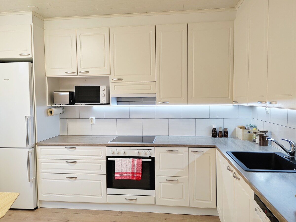 Enjoy this well equipped row house near Skinnarila university campus. You'll also have easy access to nature, including nearby forests and Lake Saimaa. Features: Bedroom Living room Bathroom Kitchen Private sauna Patio 50" 4k Smart-TV Free private parking Wi-Fi Ideal for two people but can accommodate up to four adults. Enjoy the convenience of keyless self-service check-in.