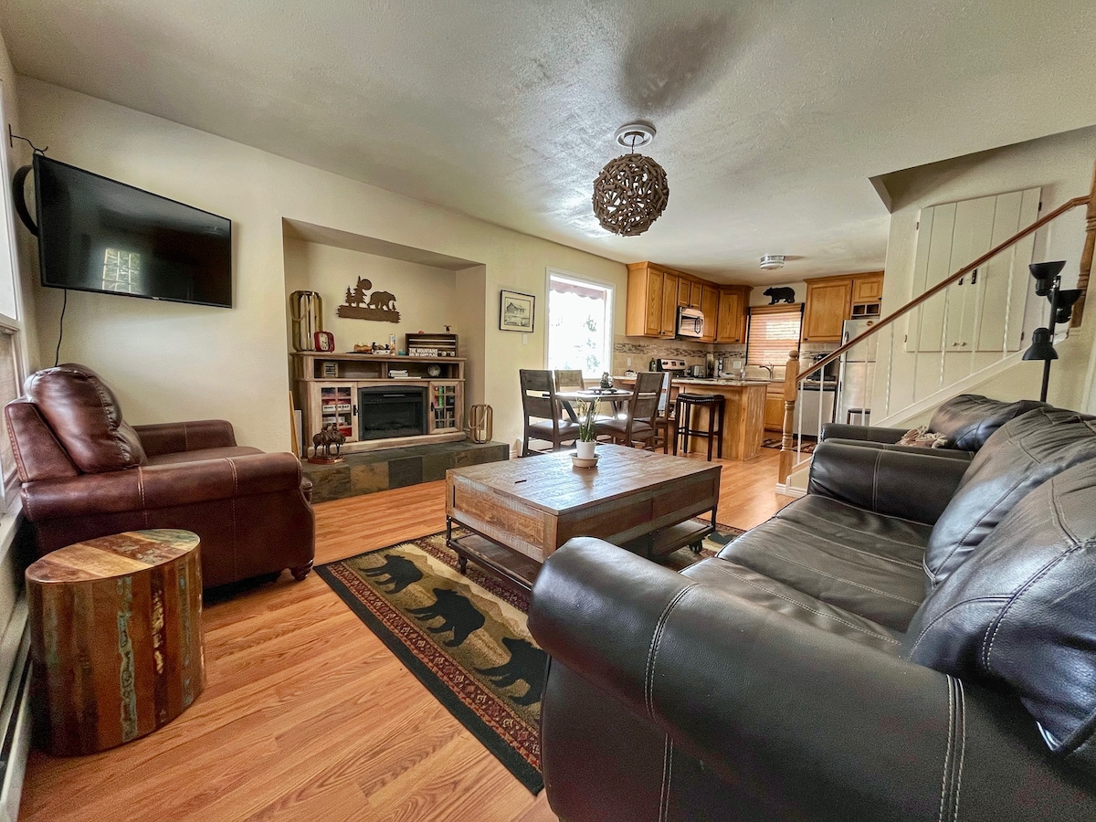 El condominio frente al río de 2 dormitorios y 2 baños cuenta con un dormitorio principal con una cama tamaño king y baño con bañera/ducha de gran tamaño. Lavadora/secadora. El dormitorio de arriba tiene una cama tamaño king y baño privado con ducha. La cómoda sala de estar tiene un sofá y una acogedora chimenea de leña de gas. Cocina totalmente equipada. Comedor. Tu terraza privada tiene un jacuzzi privado. El apartamento tiene vistas al hermoso Fall River. - Chimenea de gas. - Jacuzzi privado. - Terraza privada. - Cocina totalmente equipada. - Lavadora/Secadora. - Vistas al río Fall