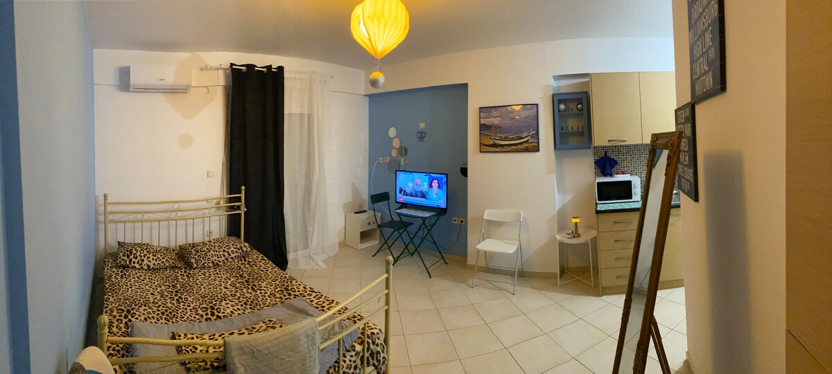Estudio situado en la calle peatonal del teatro antiguo, a pocos minutos de la plaza principal, el río Pinios y la colina de la fortaleza. Hay acceso directo a cafeterías, restaurantes, supermercados. Está situado en un pequeño edificio de apartamentos privado, limpio, cuidado y tranquilo. Cuenta con una cama doble (1,40 * 2,00), un sofá de dos plazas, una cama plegable para una tercera persona, un escritorio, calefacción autónoma (gas) y aire acondicionado.