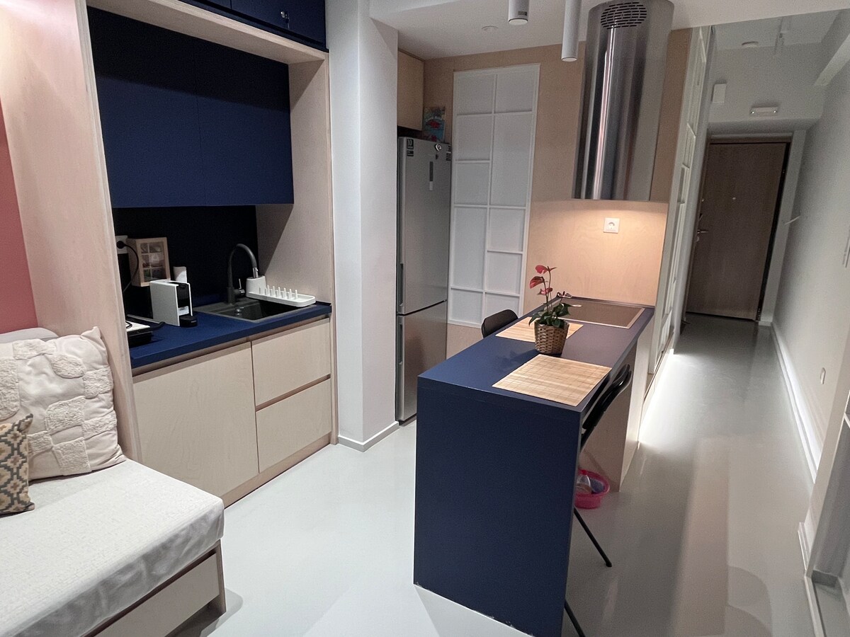 Un moderno y cómodo estudio semisótano (dormitorio, sala de estar, cocina, baño, oficina), decorado con influencias industriales, en uno de los distritos más hermosos de Larissa. Está adaptado exclusivamente a las necesidades y requisitos de los huéspedes de Airbnb, con muebles y electrodomésticos nuevos, calefacción central de gas natural y equipada con todas las comodidades modernas (Cosmote Tv, Internet 100 Mbps, etc.). ¡Será un placer ofrecerte una estancia agradable!