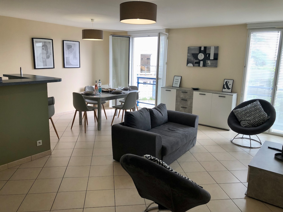 Plein Sud es un apartamento nuevo de 68 m² en el centro de la ciudad de Larmor Baden. Situado a 2 pasos del mercado y de los servicios (tiendas) y también cerca de las playas (a 3 minutos a pie). Los senderos costeros en la parte inferior del apartamento le llevarán a Berder o Gavrinis muy fácilmente. 2 dormitorios (1 cama grande por habitación) y una hermosa sala de estar. Ideal para una familia. Primera planta con ascensor, está muy bien equipado. Es el lugar donde se deja el coche, y lo hacemos todo a pie o en bicicleta