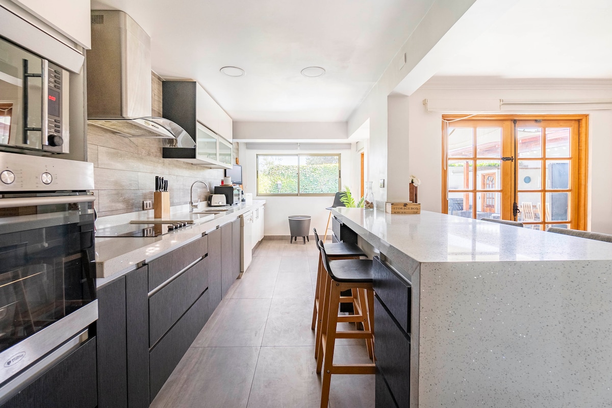 Disfruta una estancia en ¡Casa Las Condes! Esta casa familiar amplia y moderna ofrece la combinación perfecta de tranquilidad y descanso con una gran terraza, Piscina, quincho y rodeada de árboles, plaza y naturaleza. Muy acogedora, calor de hogar en invierno con estufa Bosca, ideal para familias con niños, living Home Cinema, gran cocina completamente equipada, encimera, lavavajilla y más. Dormitorio principal con baño en suite + aire acondicionado. Bicicletas para recorrer. Estacionamiento