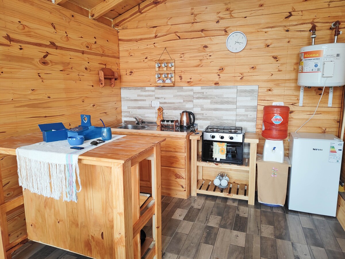 Disfruta de los espacios luminosos que provee esta mini casa. Cuenta con cocina comedor, una habitación, baño. El silencio acompañado del viento que permite escucharse el uno al otro, conecta y observa la naturaleza que te rodea y desconecta cuando te quedes bajo las estrellas.