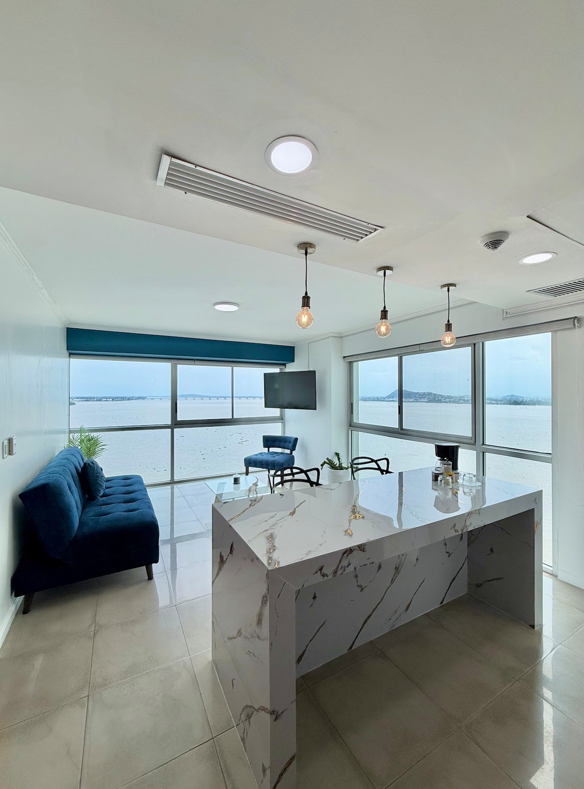 Encantador departamento con vista panorámica al majestuoso Rio Guayas. ¡Ubicación inmejorable! El departamento se encuentra rodeado de opciones de restaurantes, a solo unos pasos de las principales atracciones turísticas y centros comerciales de la ciudad ¡Una experiencia inolvidable te espera en este rincón de Guayaquil! Relájate en nuestro sofá cama y disfruta de tus series y películas favoritas. Luz natural fluye a través del ventanal, revelando vistas ideales para tus momentos de descanso.
