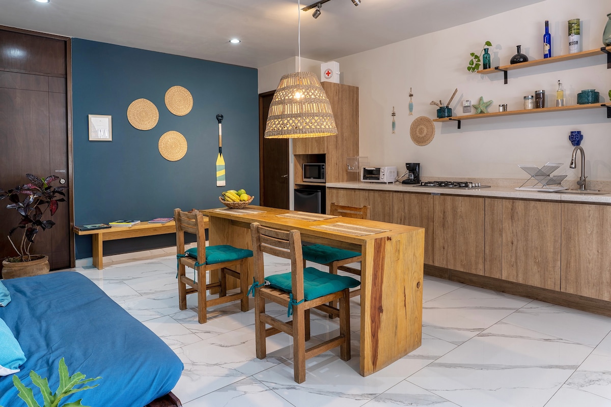 This loft is located in one of the trendiest areas of Guadalajara, but with all the comforts you need. From free parking, 24/7 security and the opportunity to walk to the supermarket or have a coffee nearby. We designed this ideal space to receive guests who want to work from home with a super internet and enjoy the city in the afternoon. The building has amenities such as a rooftop with the best 360 views of the city and an urban wall with private rooms