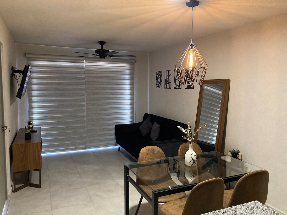 Lujoso y bonito apartamento con diseño art déco y muebles, relájate y disfruta de la vista porque está en un noveno piso, cuenta con comodidades como una pintoresca piscina, gimnasio, azotea panorámica, sala social, parrillas de barbacoa, seguridad y ascensores. El apartamento tiene una habitación con cama tamaño queen, un baño completo, lavandería, cocina completa, nevera con máquina de hielo y dispensador de agua fría. Ofrecemos 2 toallas para la ducha y 2 toallas para la alberca. También ofrecemos tours a la ciudad y pueblos mágicos.