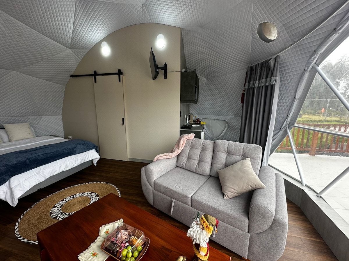 Patoa Glamping, llegaste al lugar donde la historia se entremezcla con la belleza de la naturaleza y el confort! Domo otoño, por sus cálidos colores te sentirás en una época encantada, donde cada hoja dorada es un poema de la naturaleza y cada paso en su alfombra de hojas un viaje con nuevos recuerdos.