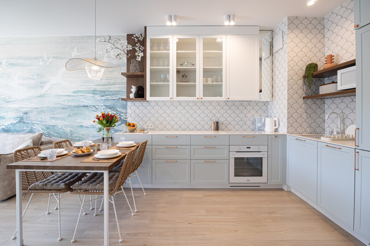 El apartamento es amplio, decorado en tonos luminosos y acogedores, refiriéndose al ambiente costero. Hay una cocina pequeña bien equipada, perfecta para preparar comidas, una sala de estar y un balcón donde puedes disfrutar de tu café por la mañana mientras admiras la zona. Además, la propiedad cuenta con servicios como una plaza de estacionamiento y wifi gratuito que hacen que la estancia sea cómoda para familias con niños y parejas que buscan una escapada romántica.
