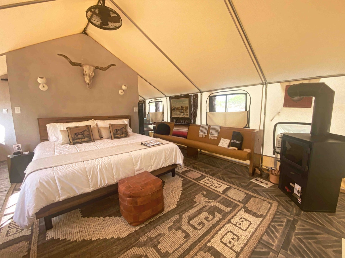 Terlingua Belle es una tienda de campaña amueblada de 13 pies con calefacción, aire acondicionado y un baño privado ubicado a pocos minutos de Ghosttown. La tienda está instalada en un «rincón» privado de la propiedad, ¡no hay otras tiendas o tipis en la propiedad! Los cómodos asientos al aire libre ofrecen una vista increíble del cielo nocturno, así como hermosos amaneceres. Los senderos iluminados conducen desde el aparcamiento hasta la tienda y desde la tienda hasta el baño. Belle se encuentra a aproximadamente 1 milla de la autopista en un camino de tierra.