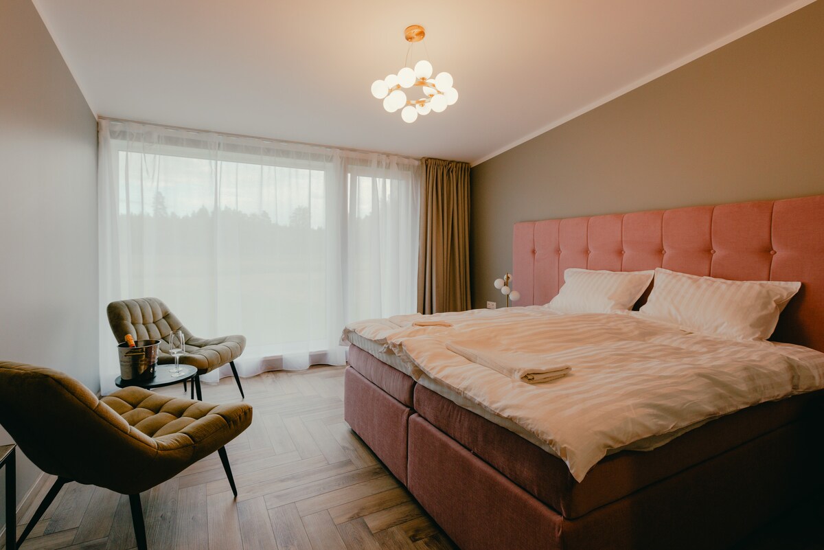 Alojamiento estupendo en Riga. El centro de la ciudad está a 10 minutos. Cerca del parque forestal y el lago con la playa. Excelente ubicación para acampar, patinar y lo principal es un campo de golf en el que puedes jugar y entrenar. El lugar perfecto para la compañía de golfistas y para aquellos que quieran aprender a jugar al golf. Definitivamente apreciarás la atención que se ha puesto en el interior de la vivienda.